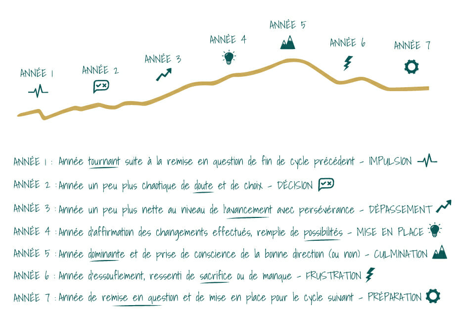 Toutes les personnes ne vont pas se retrouver dans les cycles de 7 ans et que l’on suive ces cycles-là ou d’autres cycles ne change pas grand-chose. Mais s’y intéresser, c’est rechercher un peu plus qui nous sommes. Cela nous permet d’accepter les hauts et les bas et de comprendre si nous restons bloqués dans une courbe à un point qui ne nous convient pas.